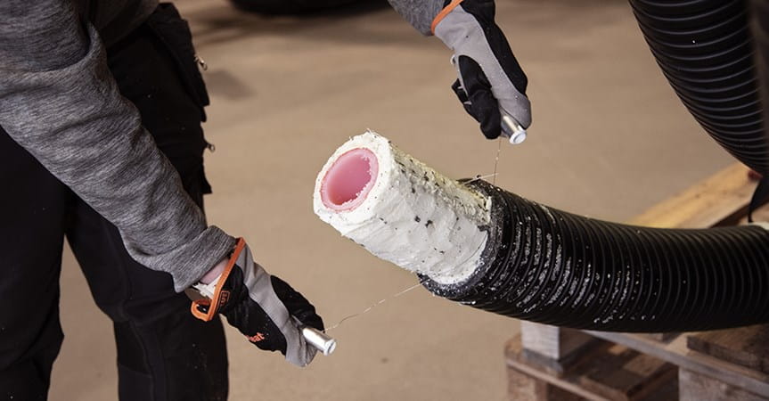 RauHeat PexFlex PLUS kulvert levereras med ett verktyg som förenklar borttagandet av PUR-isoleringen från mediaröret.