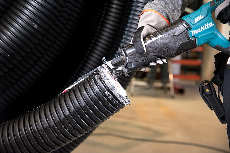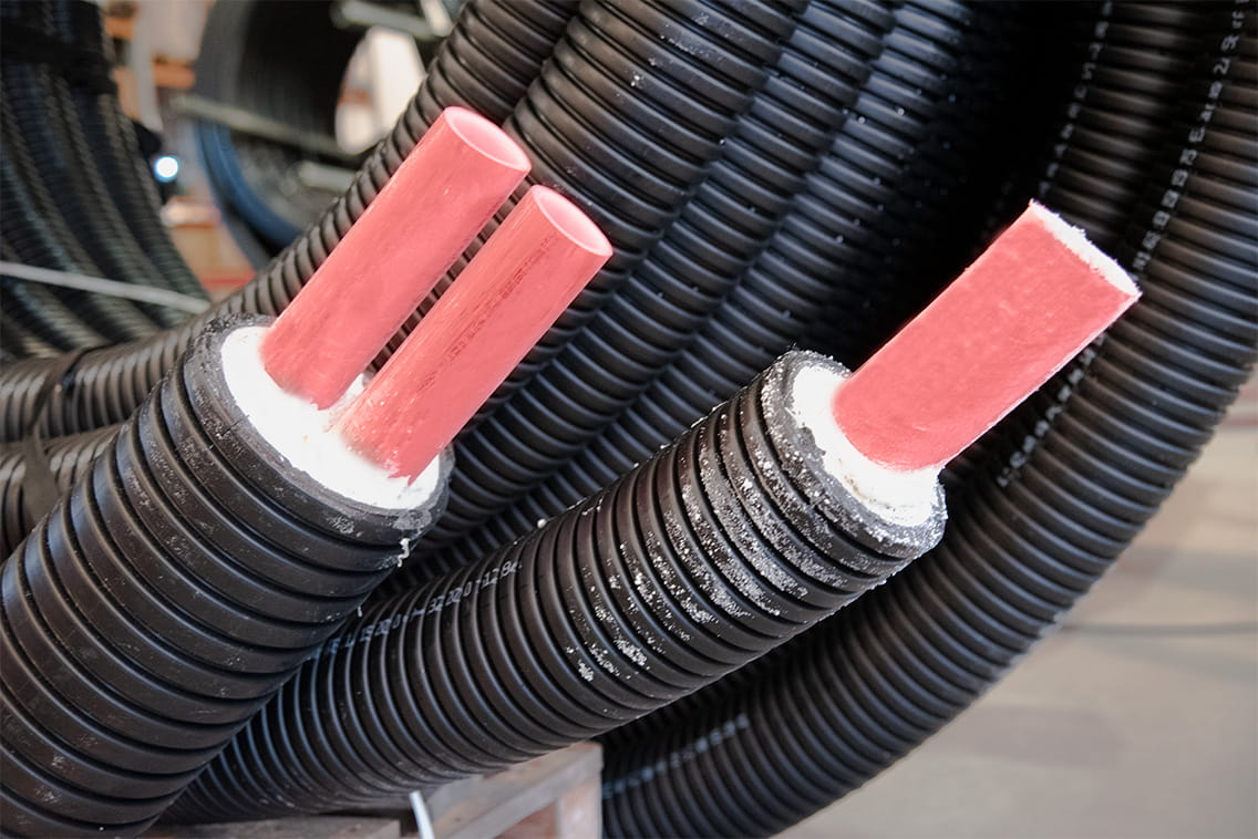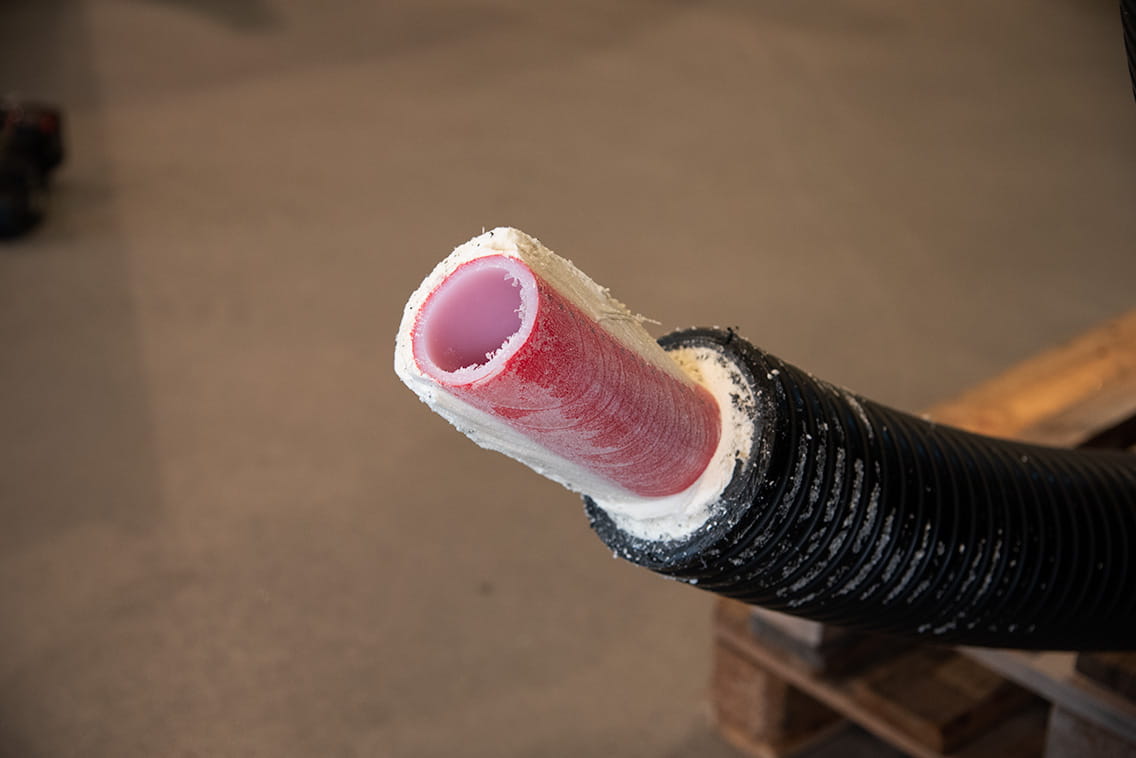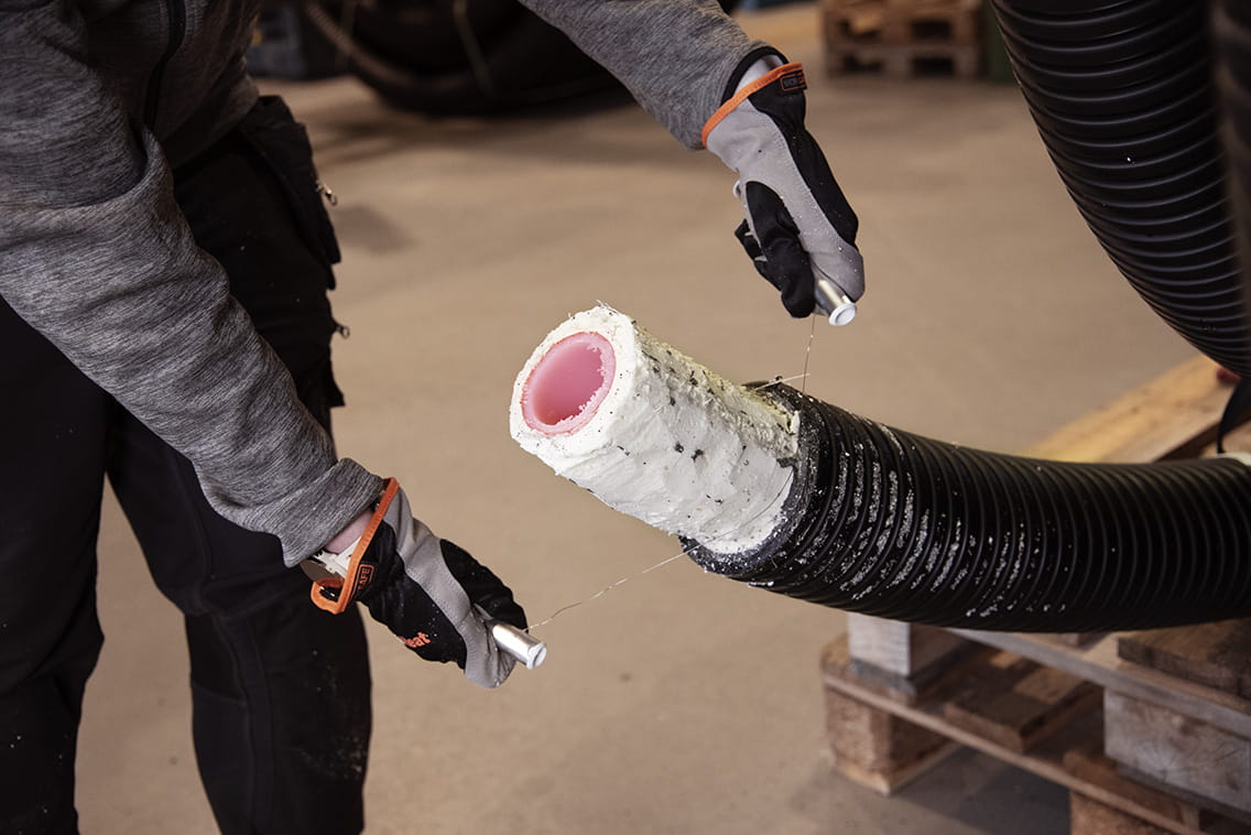 1. Avlägsna rörets korrugerade mantel och cellplastlager från önskad position på längden med hjälp av lämpliga verktyg (t.ex. tigersåg eller kniv).